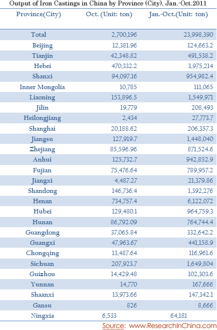 Output of Iron Castings in China by Province (City), Jan.-Oct.2011