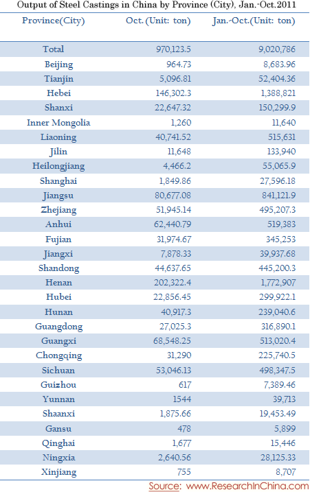 Output of Steel Castings in China by Province (City), Jan.-Oct.2011
