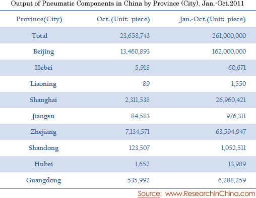 Output of Pneumatic Components in China by Province (City), Jan.-Oct.2011