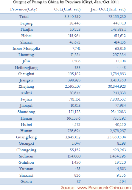 Output of Pump in China by Province (City), Jan.-Oct.2011