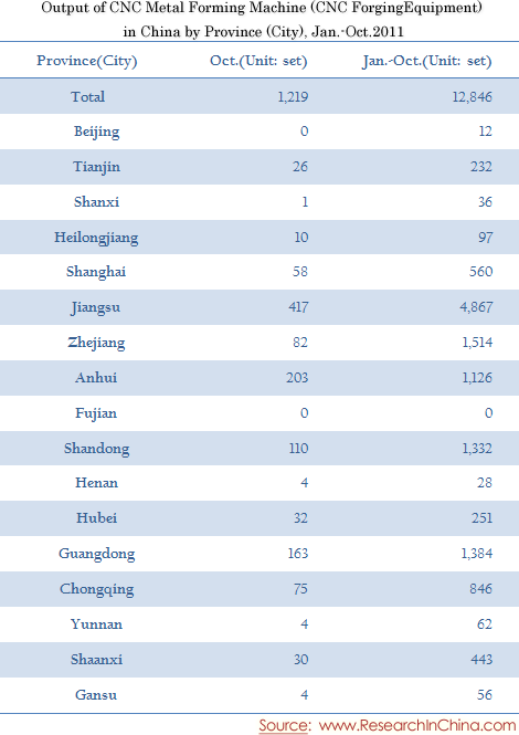 Output of CNC Metal Forming Machine (CNC Forging Equipment) in China by Province (City), Jan.-Oct.2011