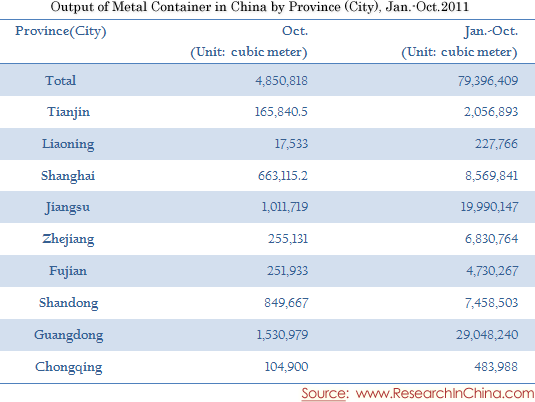 Output of Metal Container in China by Province (City), Jan.-Oct.2011