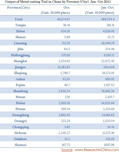 Output of Metal-cutting Tool in China by Province (City), Jan.-Oct.2011