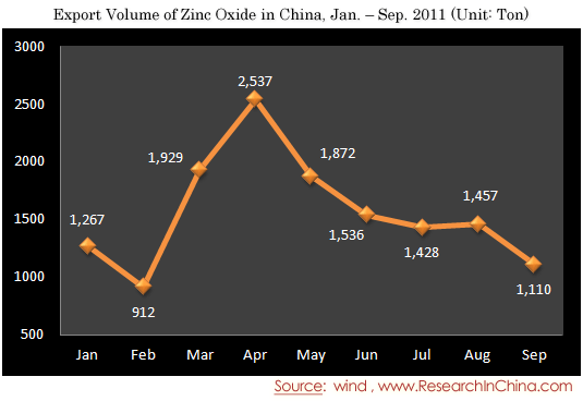 Export Volume of Zinc Oxide in China, Jan. – Sep. 2011
