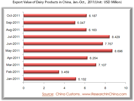 Export Value of Dairy Products in China, Jan.-Oct., 2011