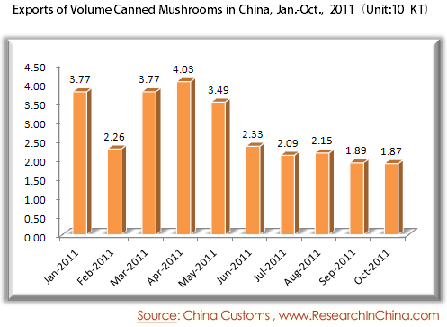Exports of Volume Canned Mushrooms in China, Jan.-Oct., 2011