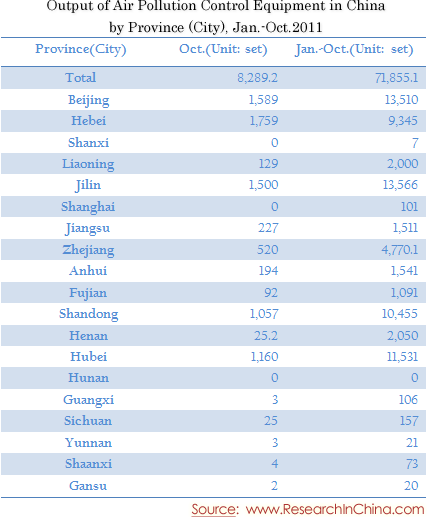 Output of Air Pollution Control Equipment in China by Province (City), Jan.-Oct.2011
