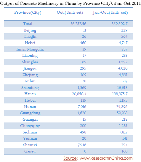 Output of Concrete Machinery in China by Province (City), Jan.-Oct.2011