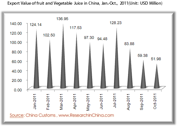 Export Value of fruit and Vegetable Juice in China, Jan.-Oct., 2011