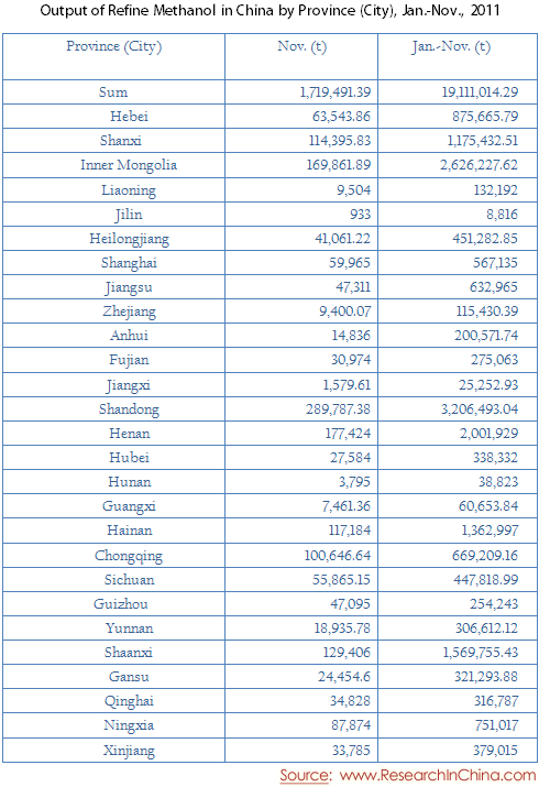 Output of Refine Methanol in China by Province (City), Jan.-Nov., 2011