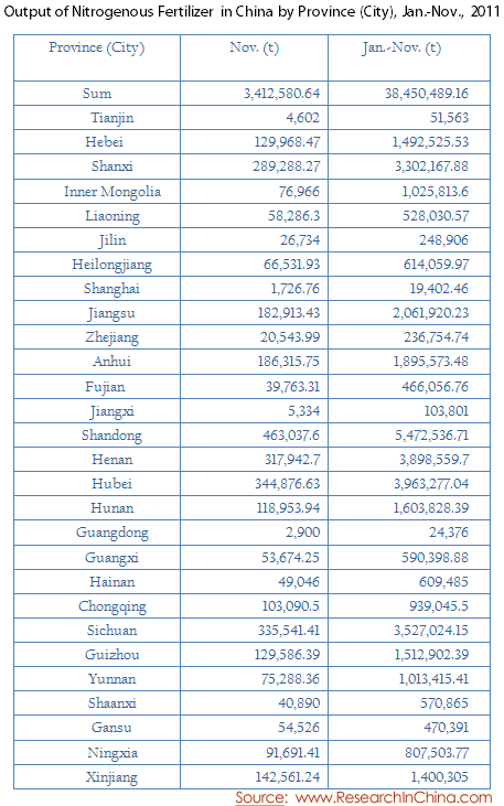 Output of Nitrogenous Fertilizer in China by Province (City), Jan.-Nov., 2011