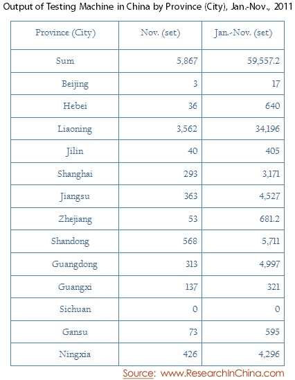 Output of Testing Machine in China by Province (City), Jan.-Nov., 2011