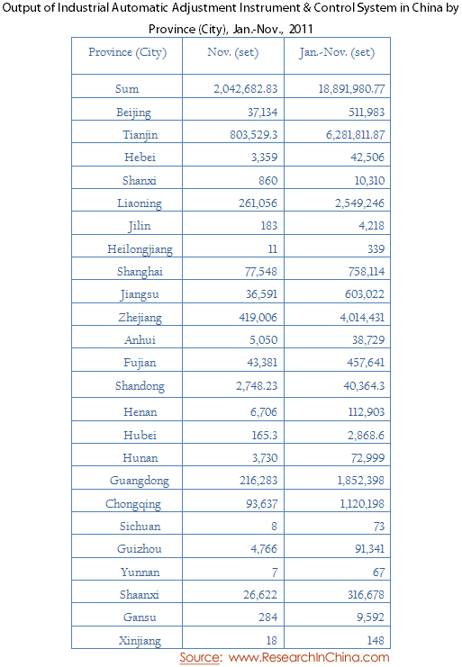 Output of Industrial Automatic Adjustment Instrument & Control System in China by Province (City), Jan.-Nov., 2011