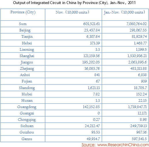 Output of Integrated Circuit in China by Province (City), Jan.-Nov., 2011