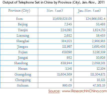 Output of Telephone Set in China by Province (City), Jan.-Nov., 2011
