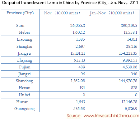 Output of Incandescent Lamp in China by Province (City), Jan.-Nov., 2011