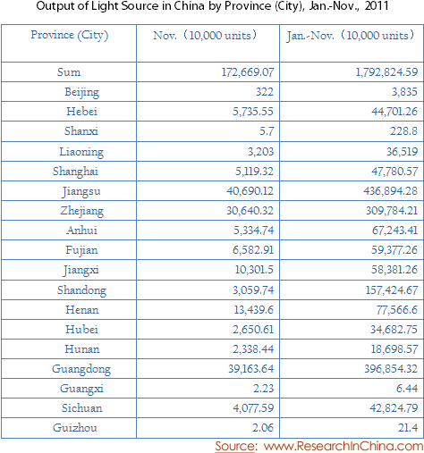 Output of Light Source in China by Province (City), Jan.-Nov., 2011