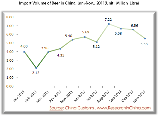 Import Volume of Beer in China, Jan.-Nov., 2011