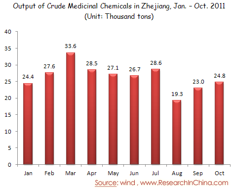 Output of Crude Medicinal Chemicals in Zhejiang, Jan. – Oct. 2011