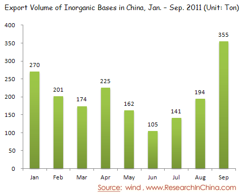 Export Volume of Inorganic Bases in China, Jan. – Sep. 2011