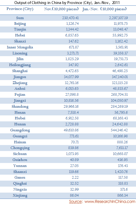 Output of Clothing in China by Province (City), Jan.-Nov., 2011
