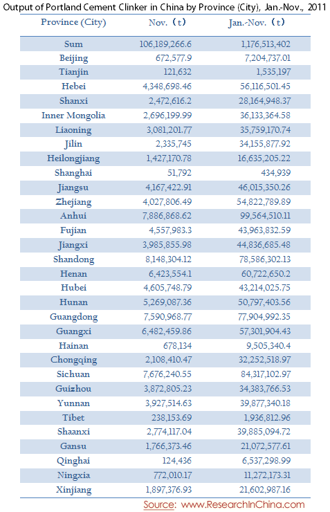 Output of Portland Cement Clinker in China by Province (City), Jan.-Nov., 2011