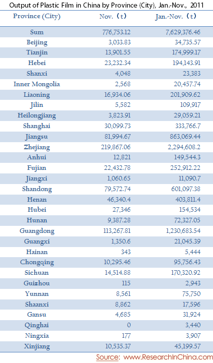 Output of Plastic Film in China by Province (City), Jan.-Nov., 2011