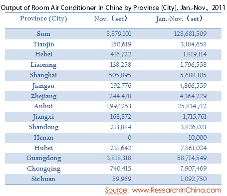 Output of Room Air Conditioner in China by Province (City), Jan.-Nov., 2011