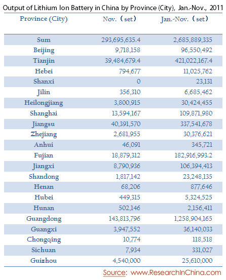 Output of Lithium Ion Battery in China by Province (City), Jan.-Nov., 2011