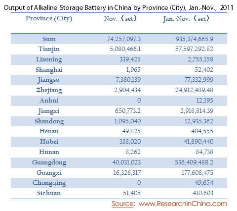 Output of Alkaline Storage Battery in China by Province (City), Jan.-Nov., 2011