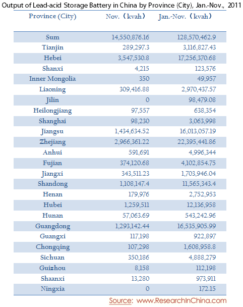 Output of Lead-acid Storage Battery in China by Province (City), Jan.-Nov., 2011