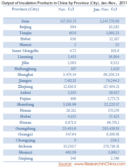 Output of Insulation Products in China by Province (City), Jan.-Nov., 2011