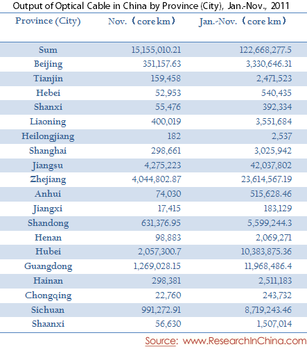 Output of Optical Cable in China by Province (City), Jan.-Nov., 2011