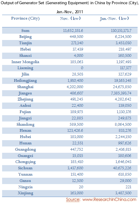 Output of Generator Set (Generating Equipment) in China by Province (City),