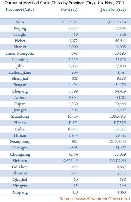 Output of Modified Car in China by Province (City), Jan.-Nov., 2011