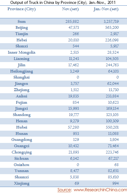 Output of Truck in China by Province (City), Jan.-Nov., 2011