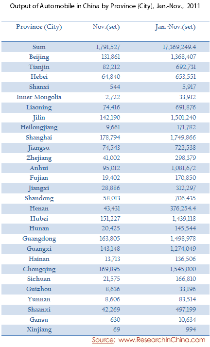 Output of Automobile in China by Province (City), Jan.-Nov., 2011
