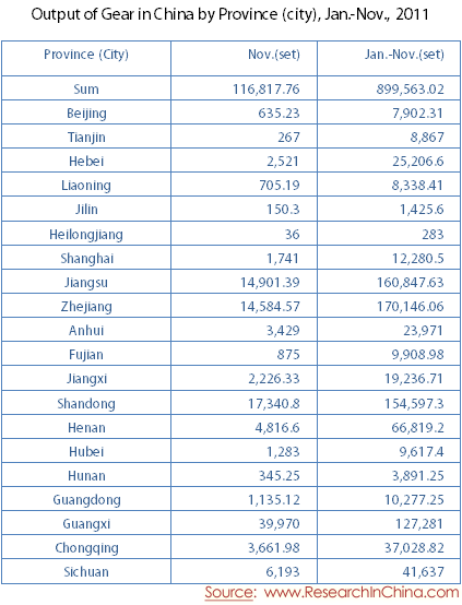 Output of Gear in China by Province (city), Jan.-Nov., 2011