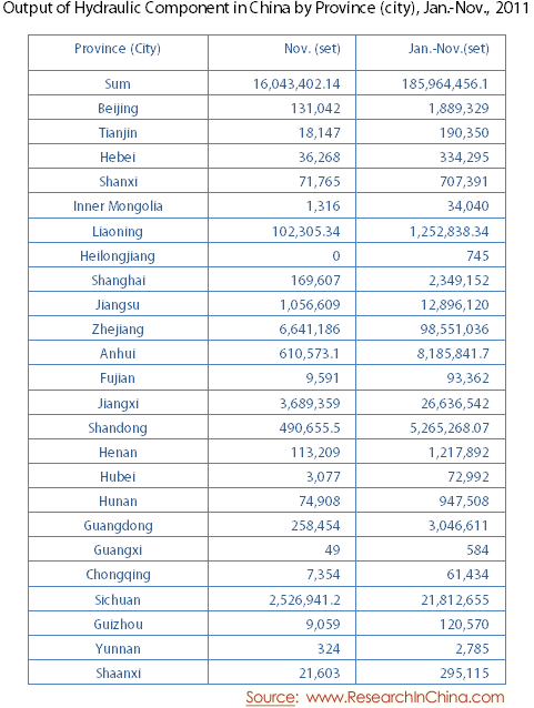 Output of Hydraulic Component in China by Province (city), Jan.-Nov., 2011