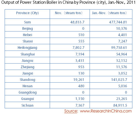Output of Power Station Boiler in China by Province (city), Jan.-Nov., 2011