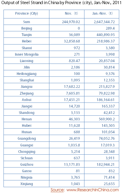 Output of Steel Strand in China by Province (city), Jan.-Nov., 2011