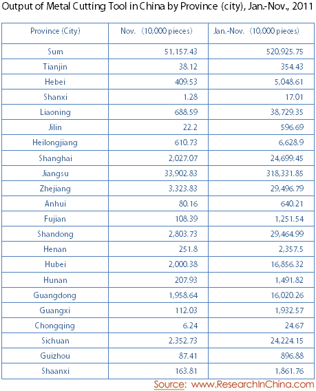 Output of Metal Cutting Tool in China by Province (city), Jan.-Nov., 2011