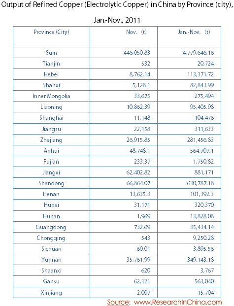 Output of Refined Copper (Electrolytic Copper) in China by Province (city), Jan.-Nov., 2011