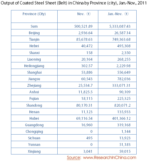 Output of Coated Steel Sheet (Belt) in China by Province (city), Jan.-Nov., 2011
