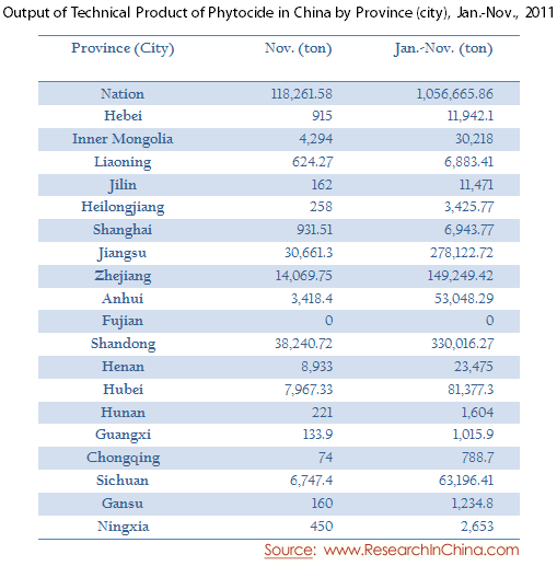 Output of Technical Product of Phytocide in China by Province (city), Jan.-Nov., 2011