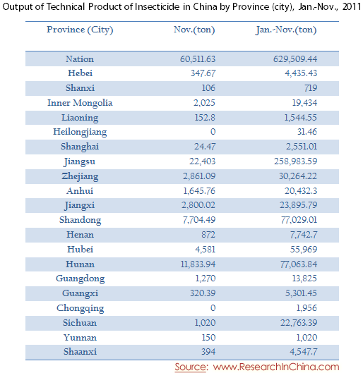 Output of Technical Product of Insecticide in China by Province (city), Jan.-Nov., 2011