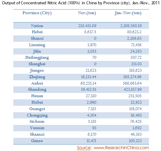 Output of Concentrated Nitric Acid (100%) in China by Province (city), Jan.-Nov., 2011
