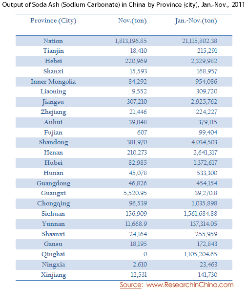 Output of Soda Ash (Sodium Carbonate) in China by Province (city), Jan.-Nov., 2011
