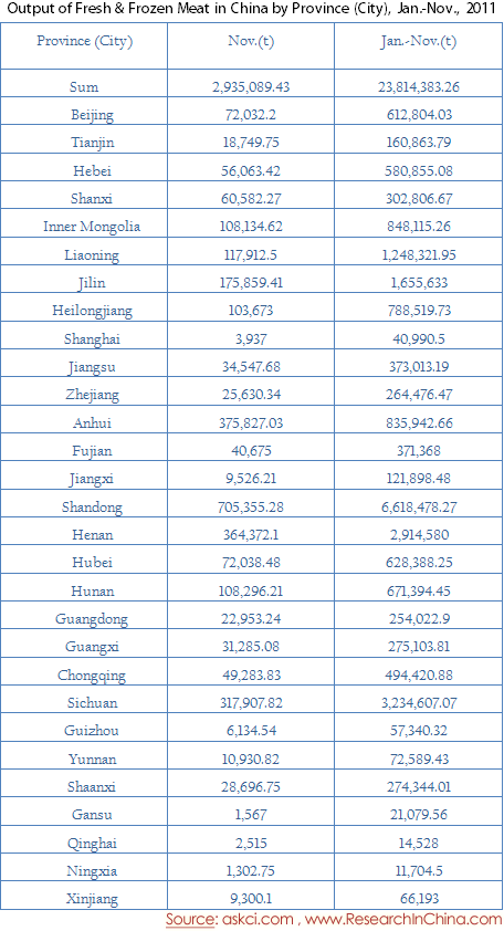 Output of Fresh & Frozen Meat in China by Province (City), Jan.-Nov., 2011