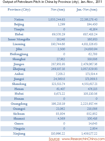 Output of Petroleum Pitch in China by Province (city), Jan.-Nov., 2011